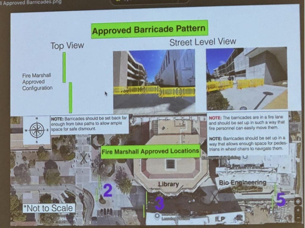 Chief Bly announced at the meeting an initiative to set up barricades between the ILP and Davidson Library to limit the amount of bike traffic in that area. Below are the barricade design patterns approved by the Fire Marshall. To be clear, the plan is still awaiting approval from other departments on campus before implementation. However, according to Bly, should the departments approve the barricade designs, they could be in place within the next week or so.