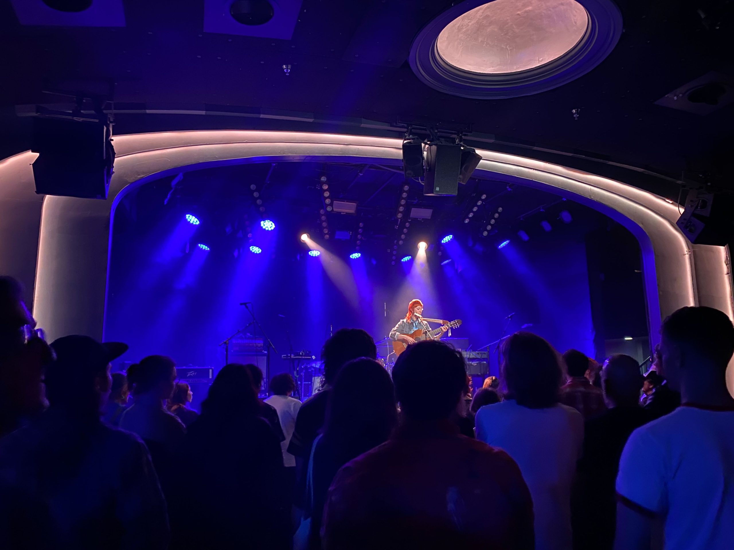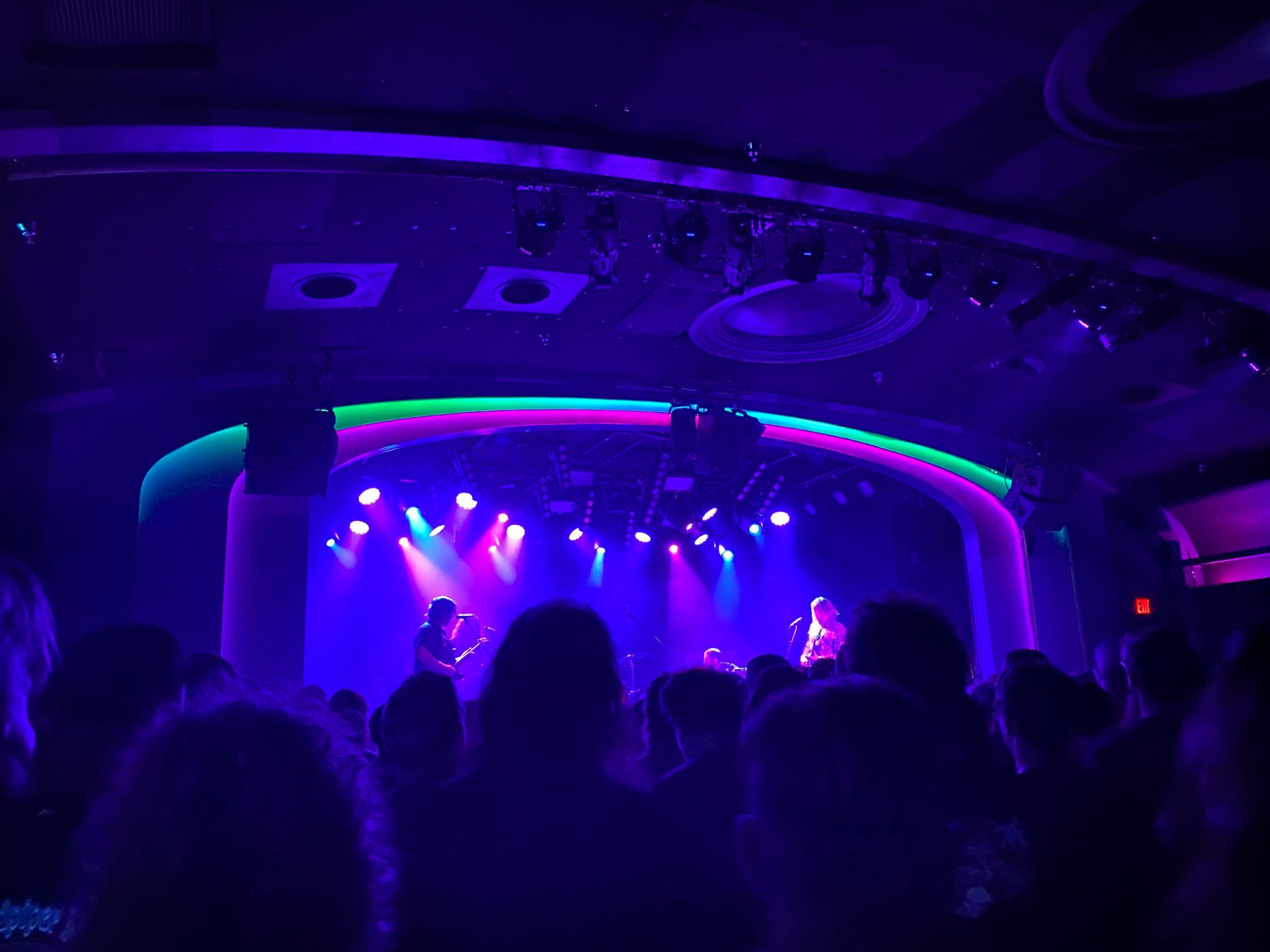 The venue’s interior was dimly lit. Its wallpaper was black with metallic bits poking through. Behind the bar sits pictures of Patti Smith and Robert Mapplethorpe, Debbie Harry, The Smiths, and The Ramones, which makes the venue feel reminiscent of the 70s legendary punk club, CBGB’s New York punk scene. While sitting at the bar, I can hear the thumping of punk music coming from the ballroom. As I make my way into the GA pit, I catch a glimpse of DJ Crenshaw, who sits on a ledge above the ballroom. He is playing vinyl from a crate, deep cuts like “Fatigue” by Blitz, and “Boredom” by the Buzzcocks. The main room is lit with a deep blue light, the ceilings are tall, slightly curved, and feature three circular sun tunnels.