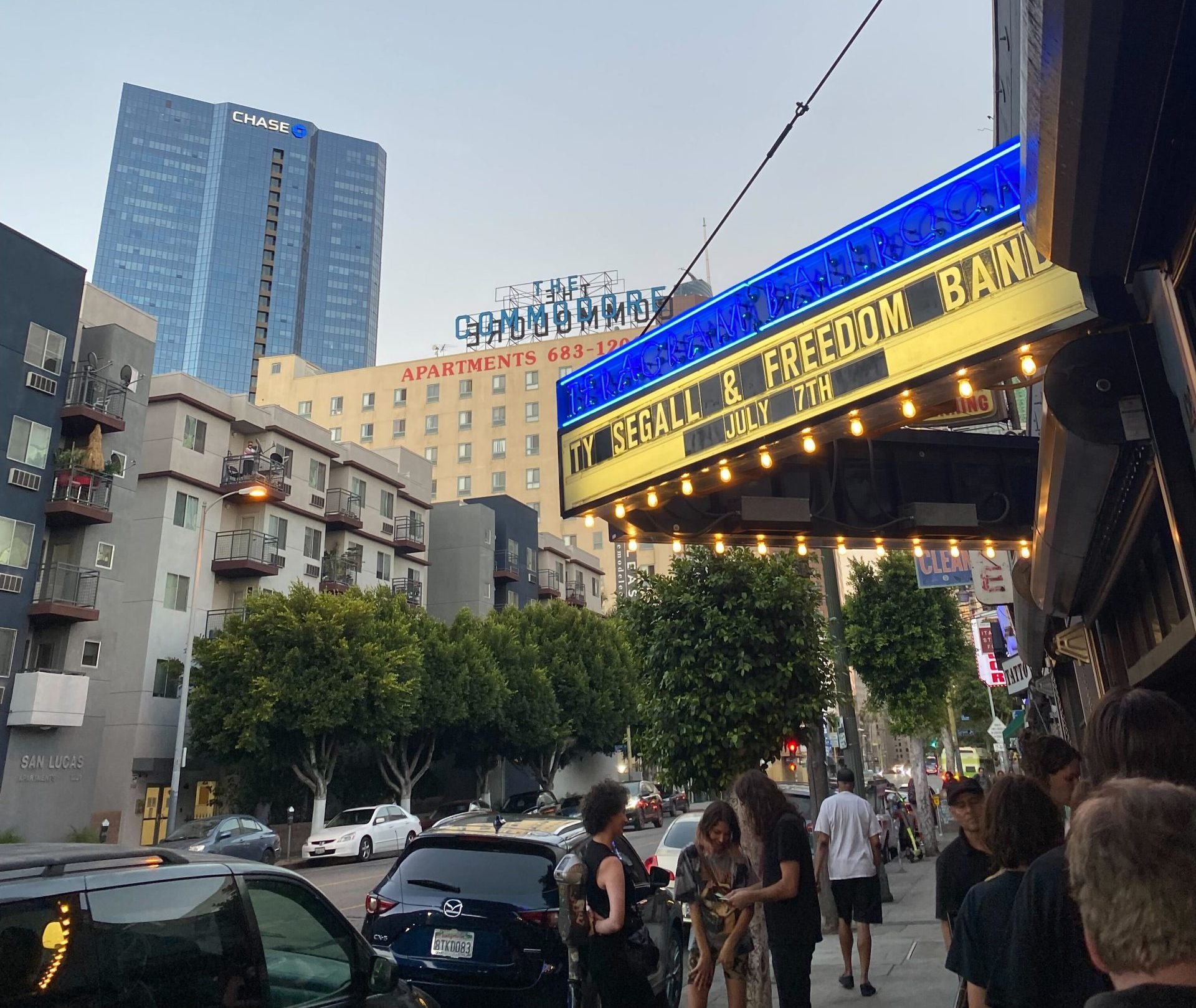 My friends and I arrive at the venue as the sun is going down. I feel a warm breeze, smell the scent of the taco truck which awaits for hungry concert-goers, and see the reflection of a slowly dimming golden light on the shiny skyscraper across the street. I’ve seen Ty Segall once before at the Lobero Theater in Santa Barbara. But, this venue feels truer to the sound of the band, which is a perfect mix of extremely loud noise-rock and psychedelic rock. We stand in line and wait for the doors to open. I have a feeling it’s going to be a good show.