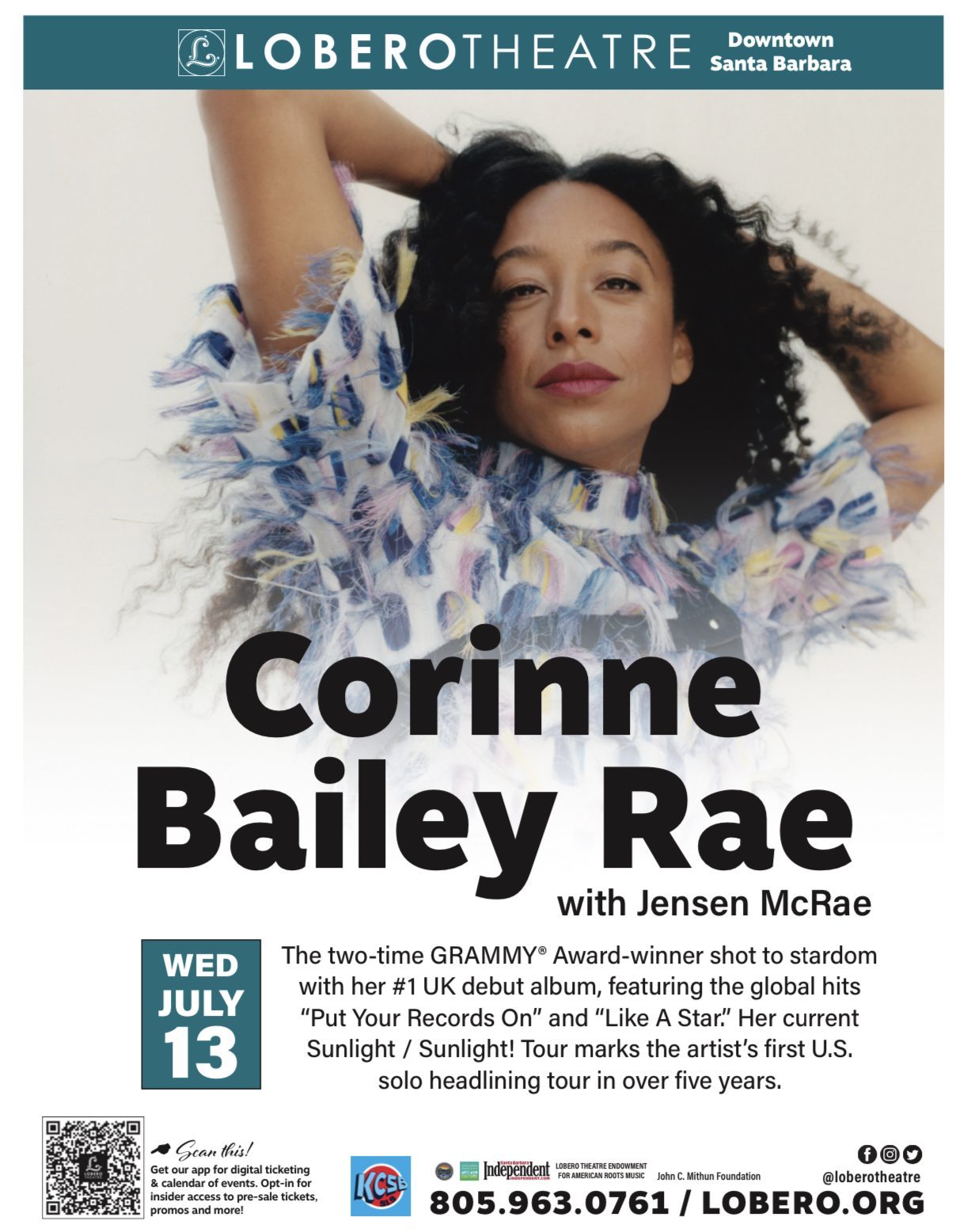 On Wednesday, July 13th at 7:30pm, Corinne Bailey Rae is performing at the Lobero Theatre as part of her SUNLIGHT / SUNLIGHT! Tour.