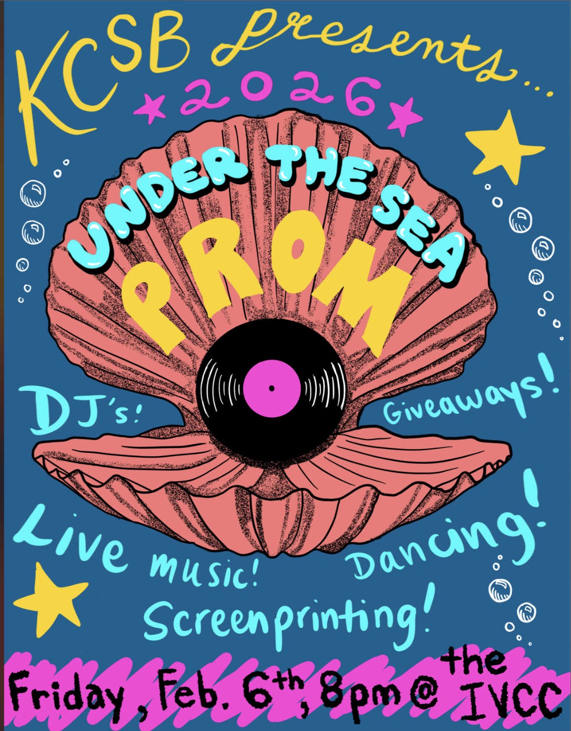 This Friday FEBRUARY 6th, 2026 from 8-MIDNIGHT at the ISLA VISTA COMMUNITY CENTER we are hosting KCSB’s very first Under the Sea themed prom!!! To promote our upcoming Fund Drive, join us for an evening of Live music, DJs, Dancing, Screenprinting, Giveaways, and so much more. Come dressed in your under the sea Prom attire… best dressed will be crowned KCSB Prom Royalty!!!! ALL ARE WELCOME TO ATTEND.